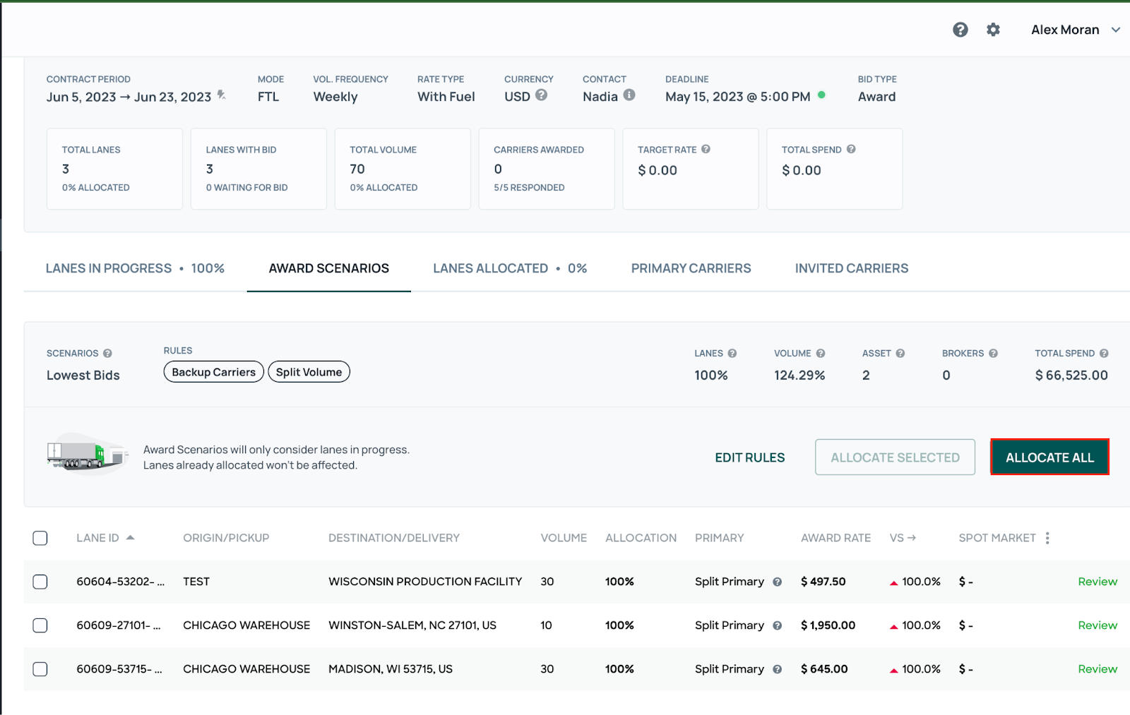 6. Click on the Lanes Allocated tab to review the carrier selections.